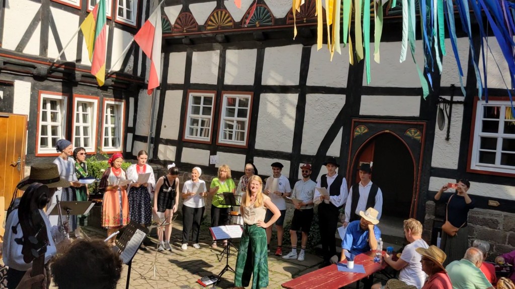 Überrascht und beglückt hat mich die Anfrage von der Sommerakademie in Marburg, die eine Chorleiterin für einen „Chor für alle“ suchte. Die Woche wurde ein solcher Erfolg, dass ich direkt wieder für 2025 engagiert wurde. Ebenfalls in Hessen, war ich zum zweiten Mal bei der Europäischen Jugendwoche auf Burg Ludwigstein zu Gast, sang jeden Morgen mit 200 jungen Europäer*innen Kanons und leitete den internationalen Lagerchor- Völkerverständigung pur.